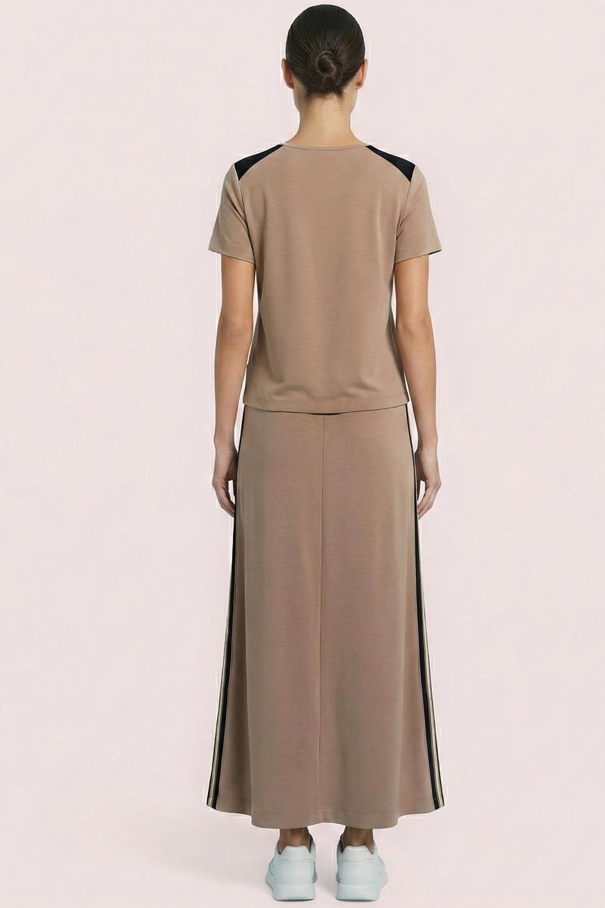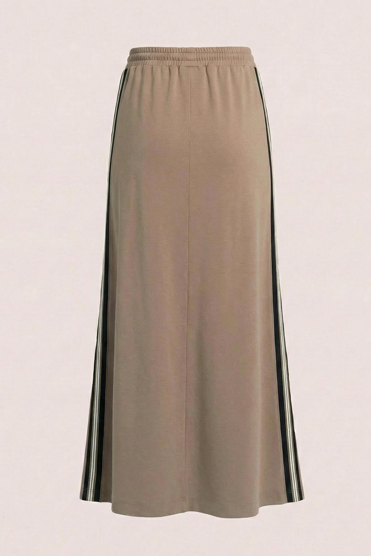 This camel knit skirt with bell-shaped hem that gradually changes in length at the ankle offers you both a visual and practical experience. One of the most important features of the product is that you can easily switch between models.