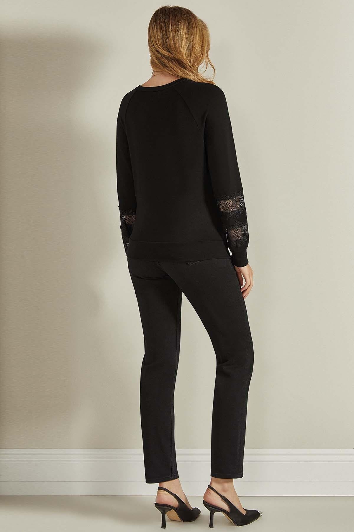 Designed for classic women who love luxurious touches, this black knitted blouse offers a noble elegance with its delicate lace detailing. The draped structure comfortably hugs the body, and the V-neck cut gracefully showcases your neckline. Combining the timeless power of black with the romance of lace, this piece is perfect for your special occasions.